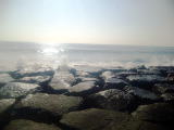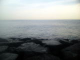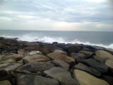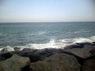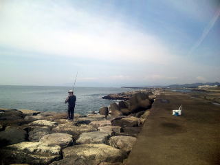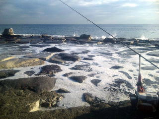 大潮満潮時という事もあり、石積みと海水面が同じ位のレベルになっていました。これでは少しのシケでも大波を被ってしまうはずです。取り込みの際うねり気がある時は、タイミングをよほど上手に合わせないと根掛かりしますので、注意が必要です。今日はあと1色程の所で、ヒラメらしき物が食ってきましたが、波をかぶる恐れがあったので後ろへ待避しながら強引に引き上げハリスも切れてしまいました。