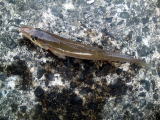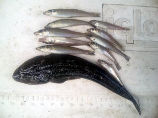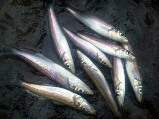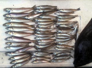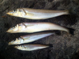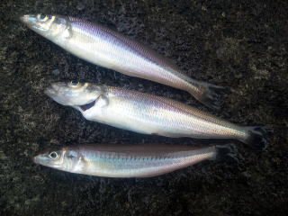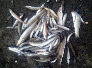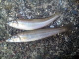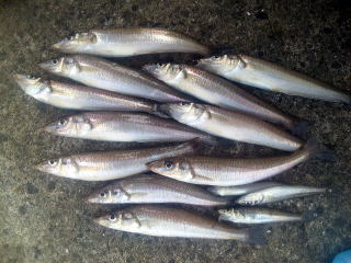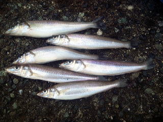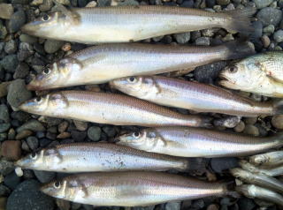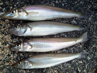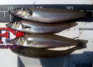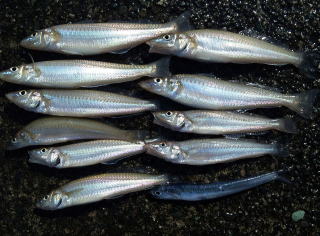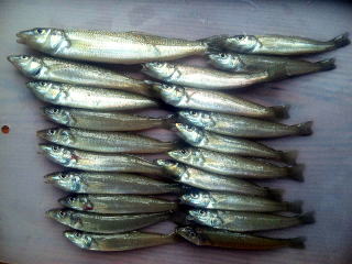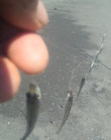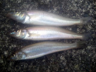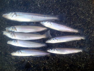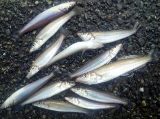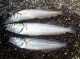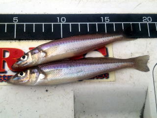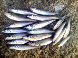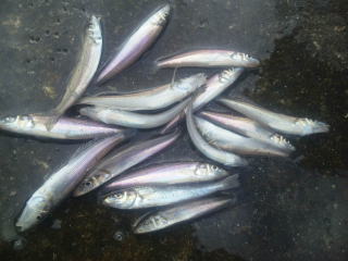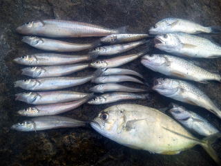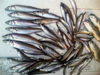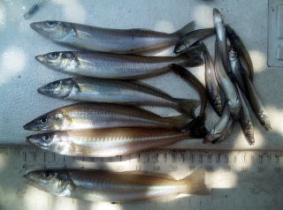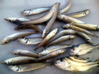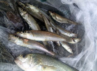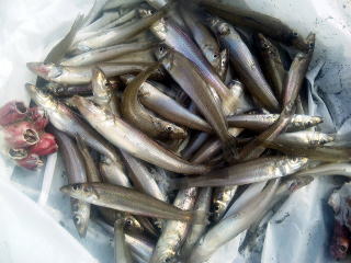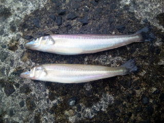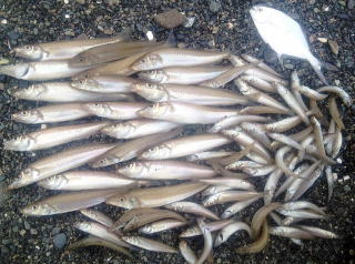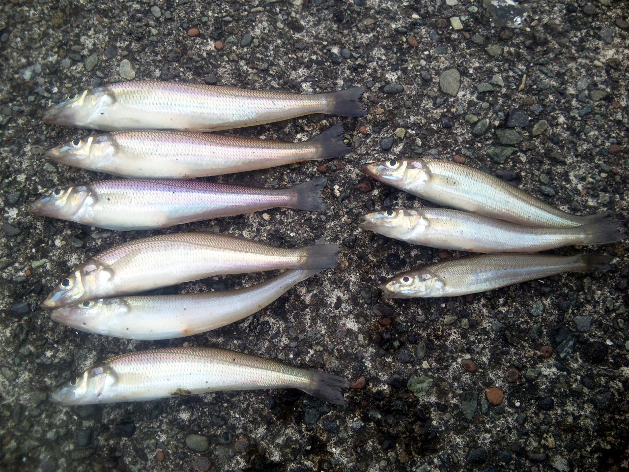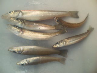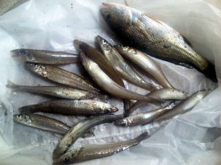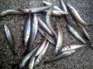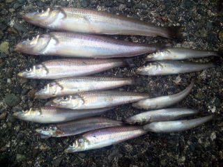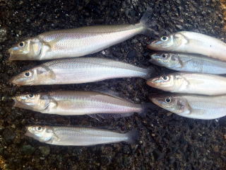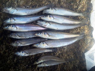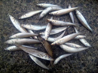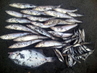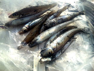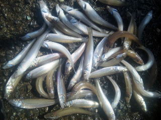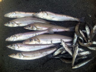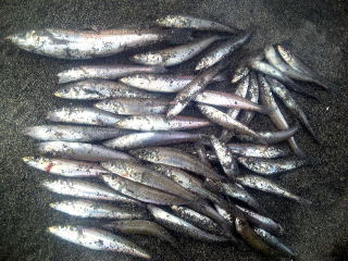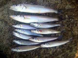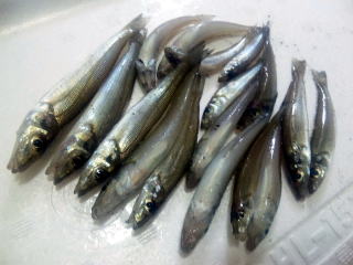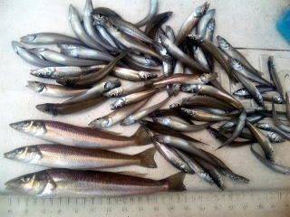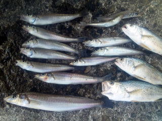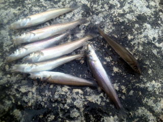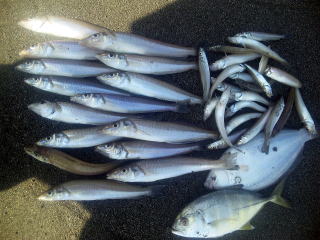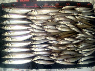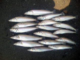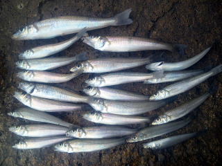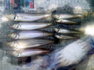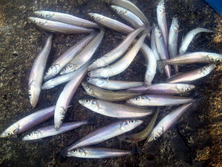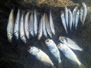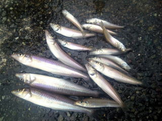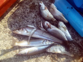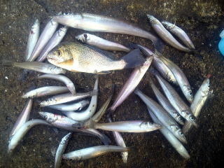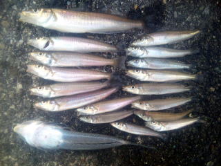 ●石積みの東から6〜7色を探ってみました。14〜5センチのピンギスが、5〜6.5色で反応していましたが、ポイントによってはゴミのたまった場所があったり、仕掛けが絡んでしまうような潮流が乱れた場所もあるようでした。特に東よりの潮目6〜6.5色にはヒイラギの群れがたまっているところがありましたが、流れに乗って集まってきたものと思われます。中央よりでは5色半〜6色でイシモチのアタリが頻繁にありましたが、針掛かりしにくく、食い上げ状態で仕掛けが頻繁に絡みました。 ●西の石積みのでは、第一ワンド辺りを境にフグが多く、先に釣っていた石積みの常連S氏によると、『2〜4色を探るとると、針がみんな無くなってしまう』との事でしたがS氏は、フグ軍団にもめげず20センチオーバーの良型を釣りあげていました。(写真下側は、S氏から頂いた残りのピンギスです。) ●ナモトが悪く、かかった魚を慎重に取り込もうとしていると、ヒラメらしき魚がキスを襲い対処のしようもなく2度連続でオモリを根掛かりさせてしまいラインを切ってしまいました。【2/403+pin6/810..=8/1213】 |
