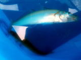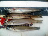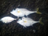 ピンギスは4色半〜5色と 6色丁度でアタリが出ましたが、オモリが浮いたようになったり潜ってしまうようになったりと潮は速めで安定せず、投入方向では仕掛けも絡まりやすかったのですが一時は、2〜3色で好調に釣り上げている人もいました。 ●強風で糸ふけも増えアタリも取りにくくなり数がのびず諦めムードの中、2度目の派手なアタリがありました。かなりの大物かホウボウだろうと思ったのですが、残念ながらちょっと期待はずれながらまあまあの19センチちょうどのヒネギスでした。 ●潮の方向や速さによって アタリがかなり大きく出るときがあり、ピンギスにも『デカイ!』と、騙されてしまうことがありました。。【3/409+pin4/828..=7/1237】 |