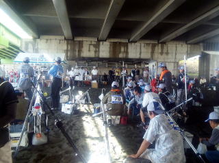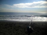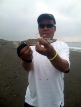 ■食わないアタリ… ●ヘッドランド東側では『チョイ投げで20〜30匹釣った』という情報も入ってきました。それに比べかなり出遅れている石積み〜西浜周辺では釣果が伸びないまま海はシケ始めてしまい、沖合からの白波も目立ち始めてきました。●波の少ないサザンビーチにもサーファーが多く、浜からは気になっているポイントを狙えなかったため、東堤のふもとあたりからビーチ沖合を狙ってみました。思った通り怪しそうなポイントにはキスが集まっているようでした。しかしアタリは毎回もあったものの食わせる事ができず、仕掛けやオモリサイズ、天秤などを何種類も交換しながらやっとの事で17〜18センチをどうにか3匹あげることができました。【3/27+pin0/33...=3/60】 ●日曜日の平チャリは、メンバーのOku氏が準優勝というすばらしい結果に終わり、全体の参加者が少なかったこともあってか、RFCの参加メンバー5人のうち4人が20位以内に入賞できました。初参戦した我が家のちびっ子1号も、イシモチを2匹釣り上げ