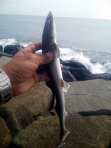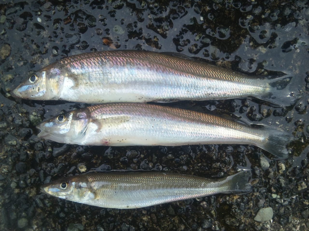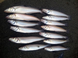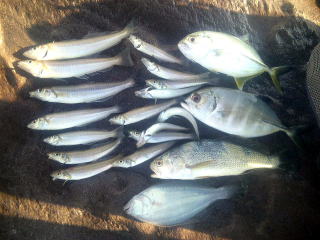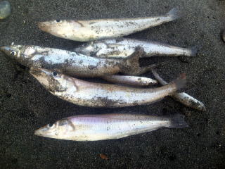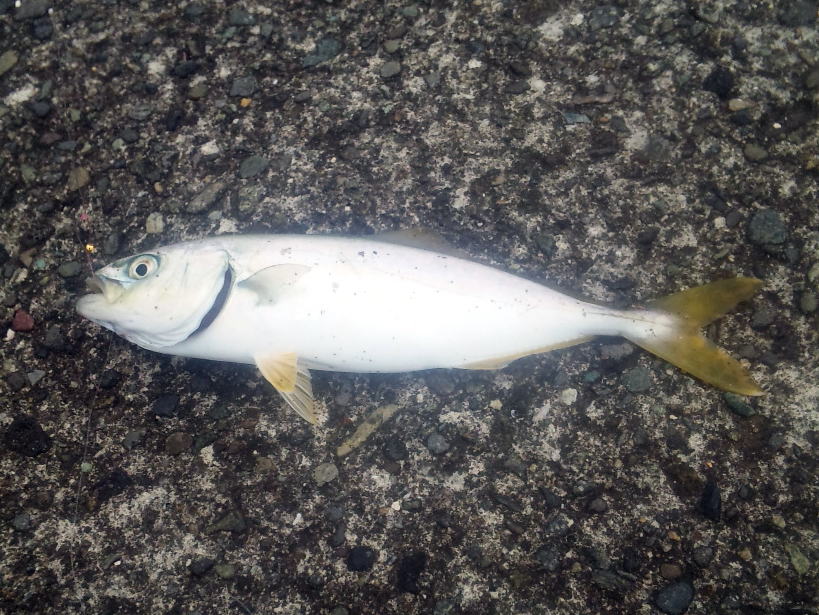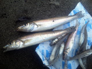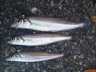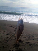 ■イシモチのアタリ ●この所シケっぽい日が続いていたので、西浜海岸にはかなりのゴミがあるのかと思っていたら、漂流ゴミも全くなく沖の波が立ち始める裏側アタリから探ってみました。すると一投目から4.5色でイシモチの豪快なアタリがありましが、あと半色辺りまで寄せた時不覚にもばらしてしまいました。(これはかなり大きかったと思います。)その後もイシモチのアタリが続きましたがどうも上手く食わせることができず、南風が強くなり始めると次第にアタリもなくってしまいました。●唯一あがったイシモチは最近釣れている主流サイズのようで、22-3センチ程でしたが割と太っていました。イシモチの塩焼きはこのサイズでもかなり美味しいです。※熱々より冷めてからの方が味に旨みが出ます。 |