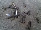 ■西浜は海藻ごみ ●西浜海岸は濁りと海藻ゴミが多く釣り人の姿はありませんでした。時間はあまりなかったのですが港まで移動し様子を見ることにしました。 ●アタリが出たポイントは5〜6色でした。手前はヒイラギの入れ食い状態で仕掛けが長いほどヒイラギにおそわれる確率が高いような感じでした。 潮が変わり始めるとキスのアタリなくなりメゴチになってしまいました。 【2/59+pin1/43...=3/102】 |
