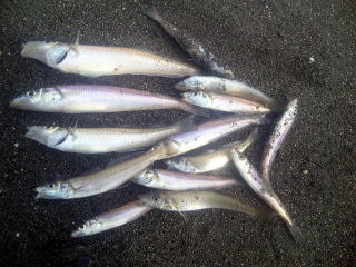 ■今日はチョイ投げ有利 ●12時迄 柳島〜西浜の様子をみましたが、ベタ凪の様に見えても中層の潮はかなり速く沖へ流れていました。沖にはフグが大変多く6色辺りでものんびりサビいていると針がみんな無くなってしまう程でした。遠投でフグが多い日はチョイ投げしかないような気がします。それも波口狙い。それでもフグが多い日はあきらめた方が良いようです。 ●一時放送塔下でイワシの投げサビキをしていた人達が大騒ぎをしていました。 よくよく見ると大量なイワシの群れが何物かに追われ浜に打ち上がった模様で、海に入って岸へ放り上げる人、それを拾う人…まるでどこかの国の漁法のようでした。 ●4色から手前をじっくり探って〜17.5センチが2匹あがりましたが、潮流がどんどん悪化してしまい終了しました。【2/23+pin0/22...=2/45】 |