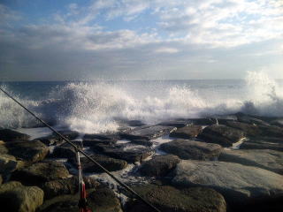 根掛かりしないようにオモリを速巻きで回収しようとしても波が寄せるタイミングが早すぎて、ずぶ濡れ覚悟で巻き取るか、針が岩にかかってしまい、キスが外れてしまうのを一か八かで釣るしかない状況でした。しかし相手はピン…。仕掛けをいくつか駄目にしてしまい、場所を変えた方が賢明のようでしたので、茅ヶ崎港へ移動しました。
