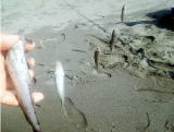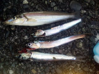 ■平塚海岸 ●休みのメンバーと三人で、平塚海岸の様子を見に行ってきましたが、釣り人が多い割りには釣果はいまいちといった様子で、時間的になのか引きあげていく人ばかり。やはり渋いのか…と、はなっからあきらめムード。●波口から5色辺りまではフグが大変多く、針を大量に取られつつも近場を攻め続けていたメンバーには18pクラスがポツリポツリ出ていました。遠投担当の私には11時半を回った頃からようやく13〜5pクラスのピンギスがアタリだしたもののたまに食ってくる程度。30〜40分で1匹の確率はこの状況の中良いのか悪いのか…。18pクラスは混じらず茅ヶ崎西浜海岸同様かなり渋い状況でした。 ●向かい風が強く遠投も6色位までしか探れず、かえって4色前後をじっくり探った方が良いような感じもしました。終了間際、波口でジャンボキス級の引ったくるようなアタリがありましたが、食わせる事はできませんでした。型の良いキスは、フグさえいなければ波口をじっくり探った方が有利に狙えそうでした。…予想以上に渋い状況でした。【1/24+pin3/27...=4/51】 |