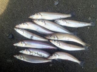 ■ようやく。 ●昨日のシケの影響が残り西浜は今日もかなりシケ気味だったので、前回の釣行でも気になったサザンポイントへ直行しました。 干潮潮止まり頃でしたが、ここ数日は定置網も漁にならないほどの潮速が続いている様子なので、潮が緩んだ潮止まりはちょうど良い時合いだったようでした。 ●前回は、アタリが出ながらも食わせ切れずに苦戦しましたので、毎年この時期、この状況に効果がある対応仕掛けを使ってみました。風と波気で遠投するほど糸フケが取り切れず アタリは小さめになってしまいましたが、高確率で針がかりさせることが出来ました。 ●5色半から釣れはじめ最終的には4色丁度で喰ってきました。釣行2時間のうちよく食ったのは潮止まり一時間位の間で、入れ食い状態となりました。連掛けのチャンスでしたが食いは浅く2連が最高で、型は17〜18センチ主体。シコイワシ、ヒイラギは少なめで本命10本でした。【10/37+pin0/33...=10/70】 |