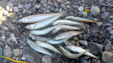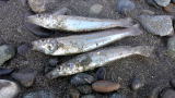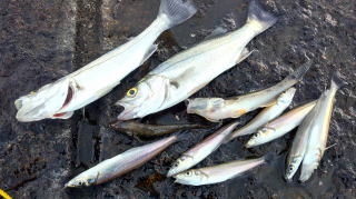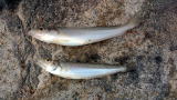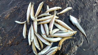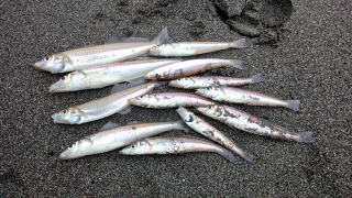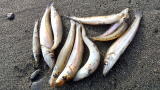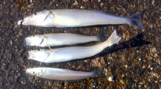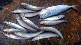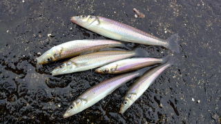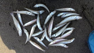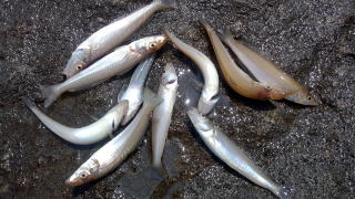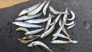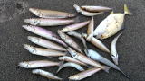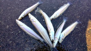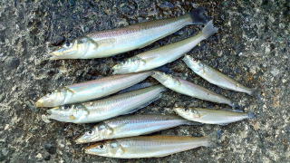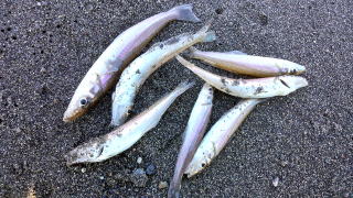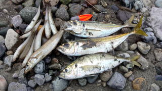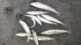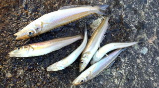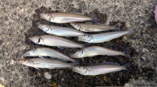 ■アタリは小さく微妙 ●昼前後2時間程の釣行で、やっとこれだけでした。干潮時、水位がかなり低くなっているのて取り込みの際には海藻で滑ったり根掛かりしないように注意が必要です。●ヒイラギが大変に多くきびしい状況でしたが、釣り船のポイントも結構変わり始めたため、更に抱卵中のタマゴもかなり大きくなってきていて潮流によっては西浜海岸の近くを回遊する可能性が出てきたような感じです。 ●しかし大潮前後の西浜は、相模川の影響を受けかなり速い潮流が発生しやすいため オモリが『ストン』と、着底するのを確認でき、スムーズなサビキができるようなポイントを見つけると釣りやすいと思います。 |