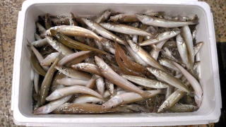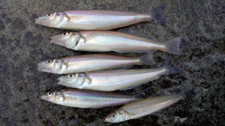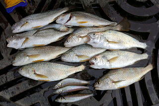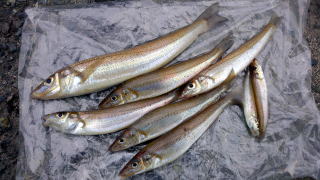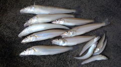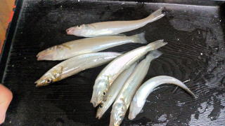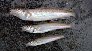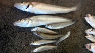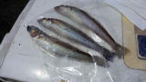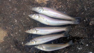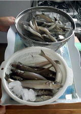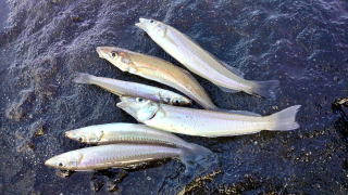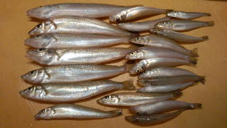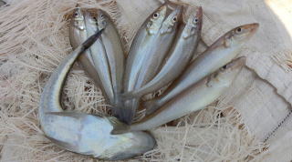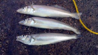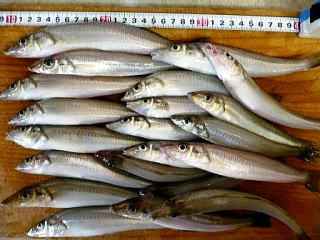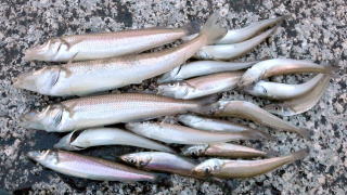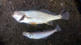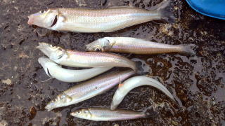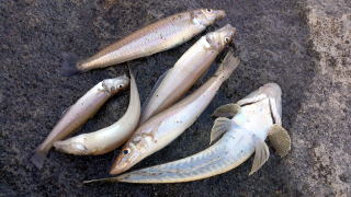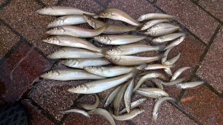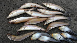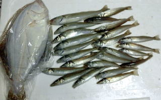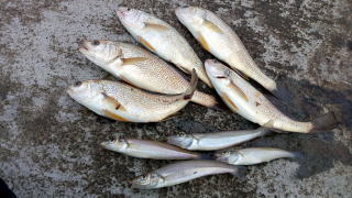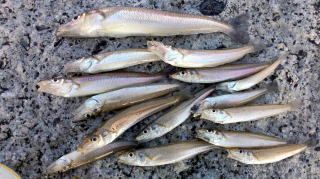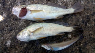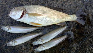 ■イシモチ釣り… ●南寄りの風が吹いて、石積みは波がかぶっていたので浜へ。波口はゴミもちらほら漂っていましたが、5〜6色前後を中心に様子を見てみました。 ●コツコツと何らかのアタリが出て、餌だけなくなってしまうことが続いていましたがキスは15センチクラスがどうにか3本でした。 ●14時を回り上げ潮3分位になると、外道のイシモチがかなり寄って来たようで、おもいっきり餌に食らいついて来ました。良型揃いだったので、いつしかイシモチ釣りになってしまいました。 ●イシモチを塩焼きにする時は、冷ましてから食べた方が旨味が強くなり美味のようです。生姜醤油をつけるとより美味しいように思います。 |