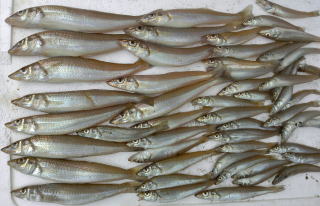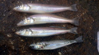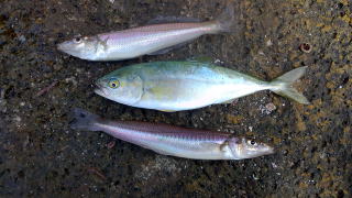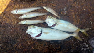 ■大波に注意 ●ここ数日、ウネリ気が入っていた為、シケに弱い石積みはかなり波をかぶっていたようです。今日は少し回復したようだったので、1時間ほど様子を見てみましたが、干潮でも時折かなり大きな波が押し寄せてきますので注意が必要です。濡れた石の所まで波がかぶると思っていれば間違いありません。西浜海岸も波足が長くナモトは悪そうでした。●ポイントは6色半で喰ってきましたが、海藻ゴミも増え南風は強めになり体力も続かず飛距離が足らないのか、キスのアタリもなくなってしまいました。 ●5色半辺りでアタリが出て、仕掛が食い上げで絡んでしまう事が何度かあり、『カタクチイワシ』が寄ってきたかな…と思っていましたが、『ワカシ』の群れだったのかもしれません。ワカシは最近仕入れ先でもよく目にするようになり、今日も30センチほどの平塚産が沢山並んでいました。 ●17〜8センチのキス2本と小さなワカシが1匹でした。 |