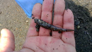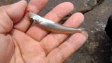 | ●海の状態が悪いので毎年夏になると気になる馬入のハゼの様子を見てきました。釣れるハゼはまだまだ小さいのですが、更に小さな超ミニハゼ(手のひらに乗ったハゼ。網ですくいました)は浅瀬にわりといましたが、毎年数が少なくなっているような感じでした。川縁をそっと歩くと時折良型が逃げる姿も見えましたが、釣るのは難しそうです。 ●ちょうど上げ潮に入ってしまい、浜で散々悩まされたヒイラギも多くなってしまいました。毎年チンチン(クロダイの子)も多いのですが、今年はまだ少ないようでした。 ハゼ釣りの常連さんの話では、『去年本流でも2〜3日通ってやっと数匹だった。』と、釣果は最悪だったそうでしたが、今年もまた厳い状況になってしまうのでしょうか。子供の頃夏休みに釣ったハゼはもっと大きく育っていたような気がしますが…。 |
