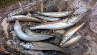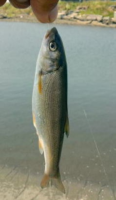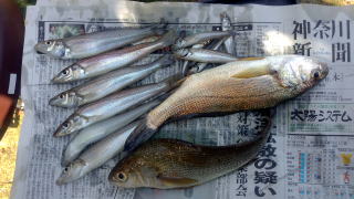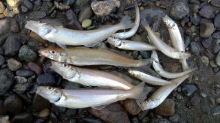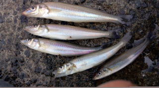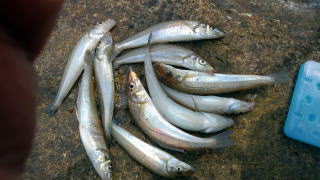 前回も今回も茅ヶ崎側の河川岸に釣り人の姿がなく、釣果・ポイントなどの情報が入手できないため以前から釣り人が多く、わりと釣れていた場所を探って見ました。 ●喰ってくるのはヒイラギばかり。オモリ着水と同時ぐらいに喰ってしまいます。対策として着水してすぐに仕掛をあおり速巻きしてヒイラギの群れをちらすつもりでしたが、かえって興味を引いてしまうのかもしれず効果の保津はわからず。そんな速巻きのおかげでセイゴが2匹ヒットしてしまいました。 ●ハゼの結果は散々で、前回4匹今日は2匹…短時間ではありましたが潮回りがあえばもう少し良いかもしれません。今回は上げ潮でしたが馬入のハゼは下げ潮の方が良いようです。 ●仕掛も竿もそのまま、石積みへ移動しキスを狙いました。 |