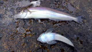 ■西浜海岸回遊開始か?! ●休みだったので、西浜へ直行したのですが海藻がかなり流れていたため、石積みへ。2時間程あちこち探りましたが『ヒイラギ』ばかり大漁でした。●14時頃から西浜に移動。ゴミが少ない定番ポイント数カ所をかなり丁寧に探ってみました。潮が上げ始めてから三分になった頃からアタリが出始めほぼ連チャンで喰ってきましたが、多くて2匹で更に追い食いを狙っても遠投でもフグが喰ってしまいました。 ●釣果は西浜海岸のみ2時間、ポイントはかなり狭く6色あたりで16センチ〜で型が揃っていました。 |