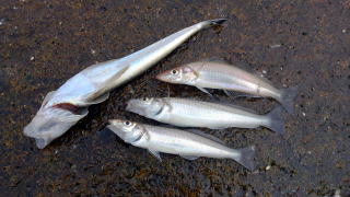 ■後が続かず、、、 ●昨日は雨だったので、濁りが入っているかと思いながら行って見ると、潮はいつもより澄んでいる位でした。一投目ヒイラギでスタートしたため、西側へ数メートル移動。ここではヒイラギの反応はなくキスのいいアタリでタートした。連掛けを狙うのですがなかなか喰わず、ピンギスが多くなり始めたのか、他の餌が頻繁に取られてしまいます。 ●ピンギスを狙っているのでしょうか、マゴチの子も喰ってきました。そんな感じで数投目までは単発ながら順調でしたが、西からドロ泡のような濁りをのせた潮目が通過すると、反応がまったくなくなってしまいました。 ●ヒイラギが多くなり数ヶ所探りましたがまったくダメで、1時間半ほど粘りましたが終了しました。 |