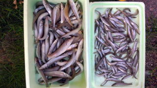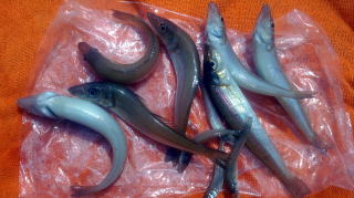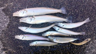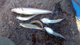 ●6色〜7色辺りでヒネの回遊もあるようなのですが、ポイントによっては今日の私のようにメゴチとピンギスのポイントにはまってしまう事もあるようです。メゴチは良型で写真右下ので18センチほどありました。 ●時間がなかったので最短の場所で投げましたが、ポイントを何カ所か探っていけばヒネに出会えそうな状況になってきています。 |