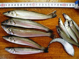 ●海は穏やかで10号以下のオモリを使って釣る波口のキス釣りには最適。私の持参した竿ではどうもあんばいが悪くアタリが大きくおもしろいのですが、針がかりさせるには結構難しい…。穂先が堅すぎるのか…。以前前打ち竿で、キスを狙ってみましたがアタリがあってもテンションが足らないのかフックせず一匹も釣ることができませんでした。ピンギス相手でもチョットはまりそうです。 ●18センチ以上のヒネは入りませんでしたが、ピン込み32匹で結構楽しむ事が出来ました。 |